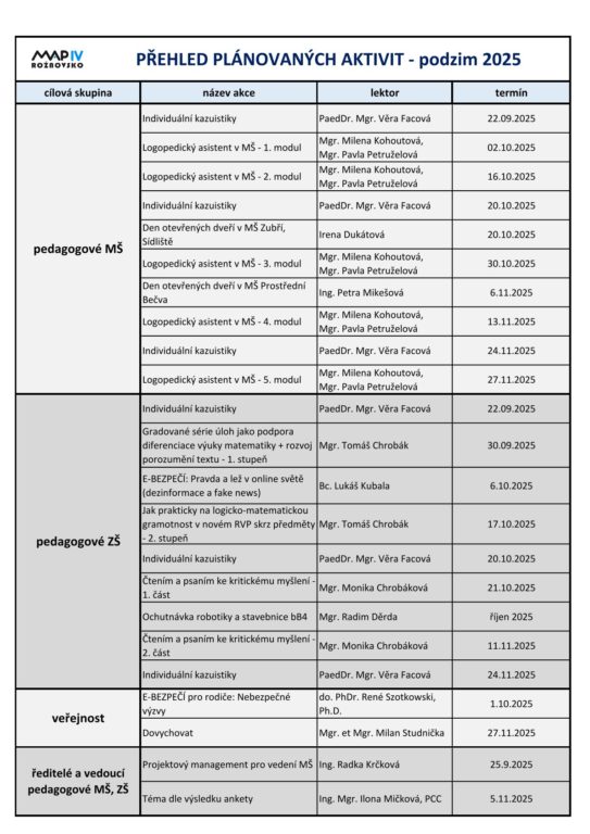 Níže naleznete přehled všech aktivit v jednotlivých měsících do konce roku 2025, kdy nám projekt MAP IV končí. Věříme, že si z nabídky vyberete. Pro lepší informovanost si Vás dovolujeme požádat, abyste tento přehled vytiskli a vyvěsili ve sborovně, případně jej svým pedagogům přeposlali elektronicky, aby měli možnost seznámit se s plánovanými vzdělávacími akcemi v dostatečném předstihu. Před každou akcí Vám samozřejmě zašleme samostatnou pozvánku s podrobnějšími informacemi, tak jak jste zvyklí.